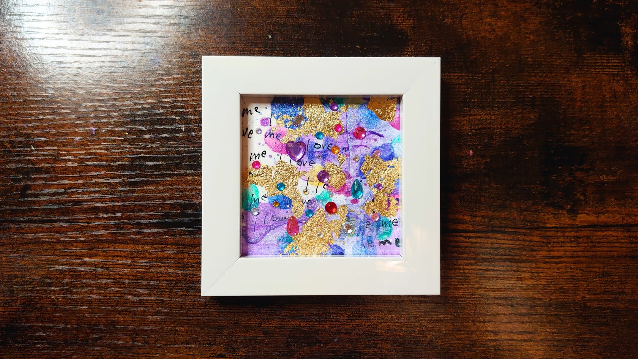 この作品はアクリル絵具で描いており、ラメ等が落ちないよう透明な画材で表面をコーティングしてあります。額の表面にガラスの板はありません。作品がむき出しの状態で額にセットしてありますので、なるべく触ったり日光に当たらないような保存方法をおすすめいたします。